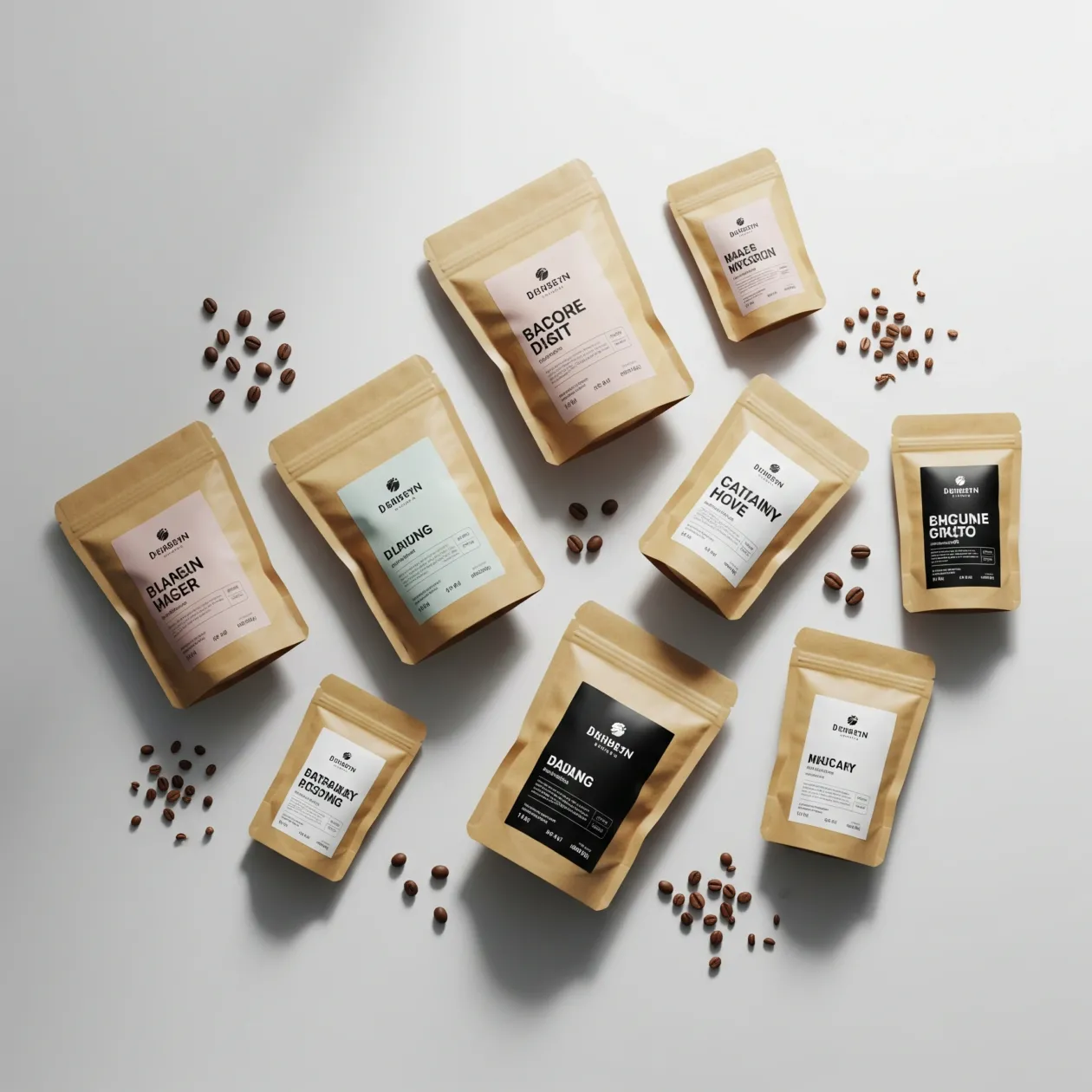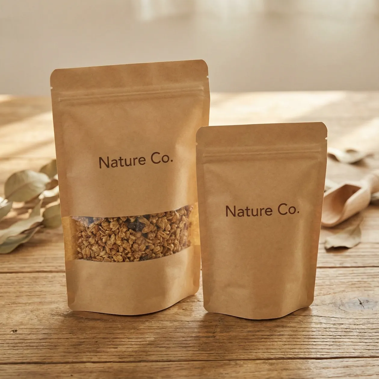 Each custom kraft pouch bag can be printed with your logo and artwork, turning every order into walking brand promotion. Stand‑up and flat kraft pouch options work for coffee, tea, bakery items and dry foods, combining shelf impact with sustainable packaging.